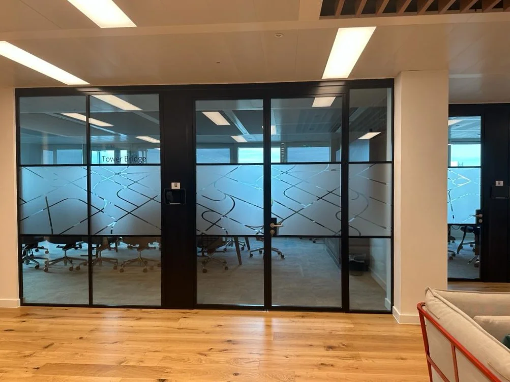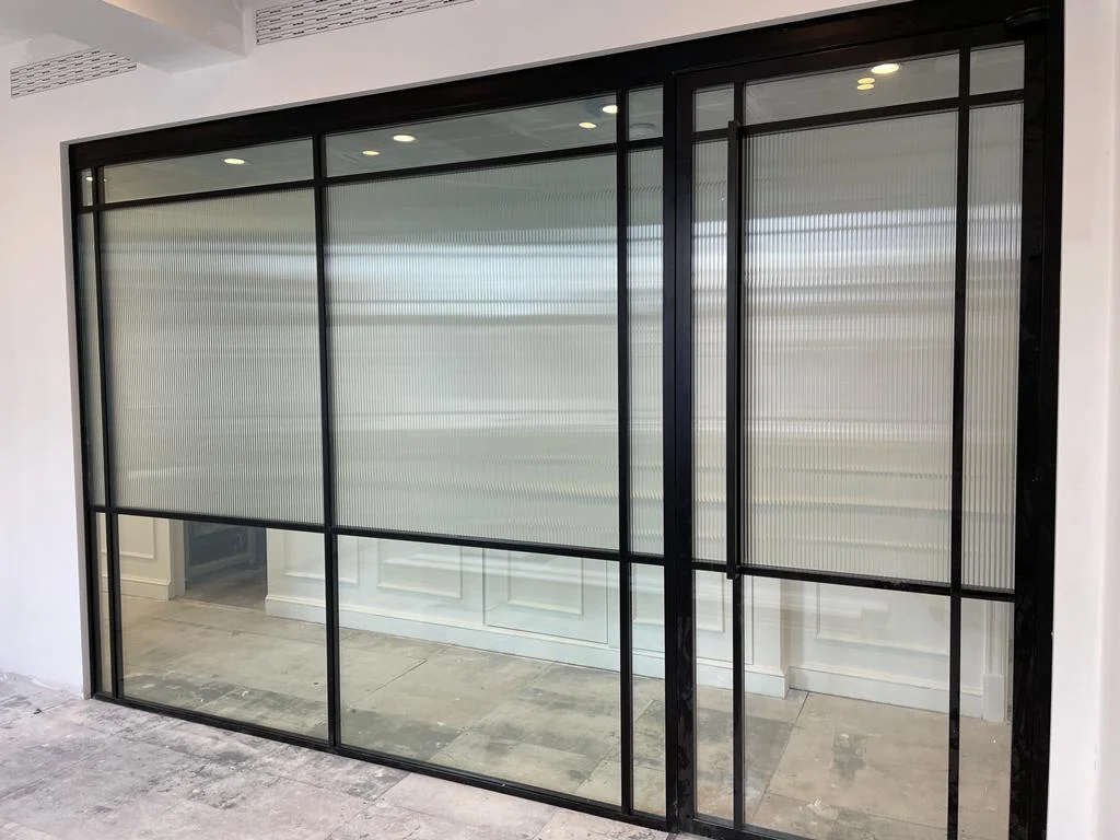 The 54 Banded is achieved by using aluminium bars and box section which can be cut & installed to bespoke layout. When installed it is flush to the trackwork for enhanced aesthetics. Bar measures 25mm wide by 6mm thick and is bonded to external faces of glass using double sided foam tape. The box section measures 13mm wide by 25 mm thick. It is bonded internally to the glass and works in conjunction with our bars to create fully banded screen with a framed appearance.
