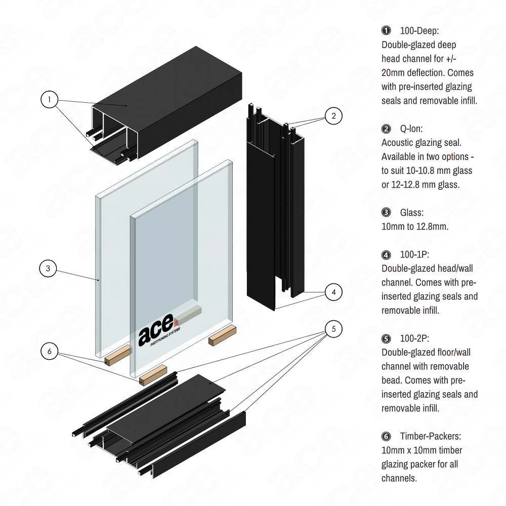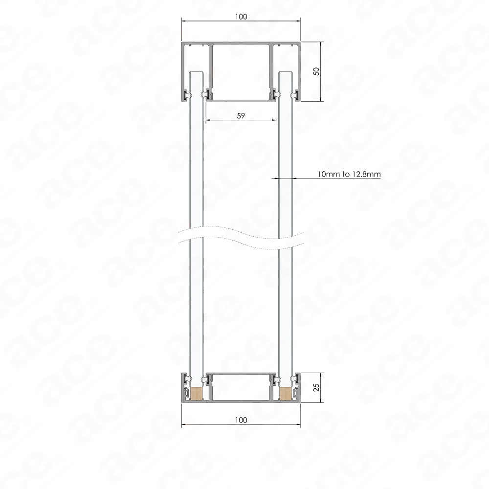 The 100mm aluminium channel (100 Deep) is a one-part aluminium section for glass partitions, designed for use as a head channel in double-glazed systems, offering a deflection range of +/- 20mm. This section provides robust structural support while accommodating movement in the installation. It features a removable infill in the middle for added flexibility.