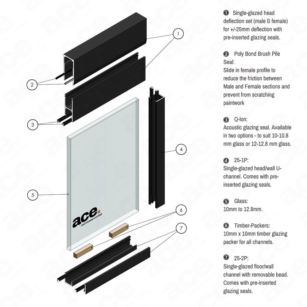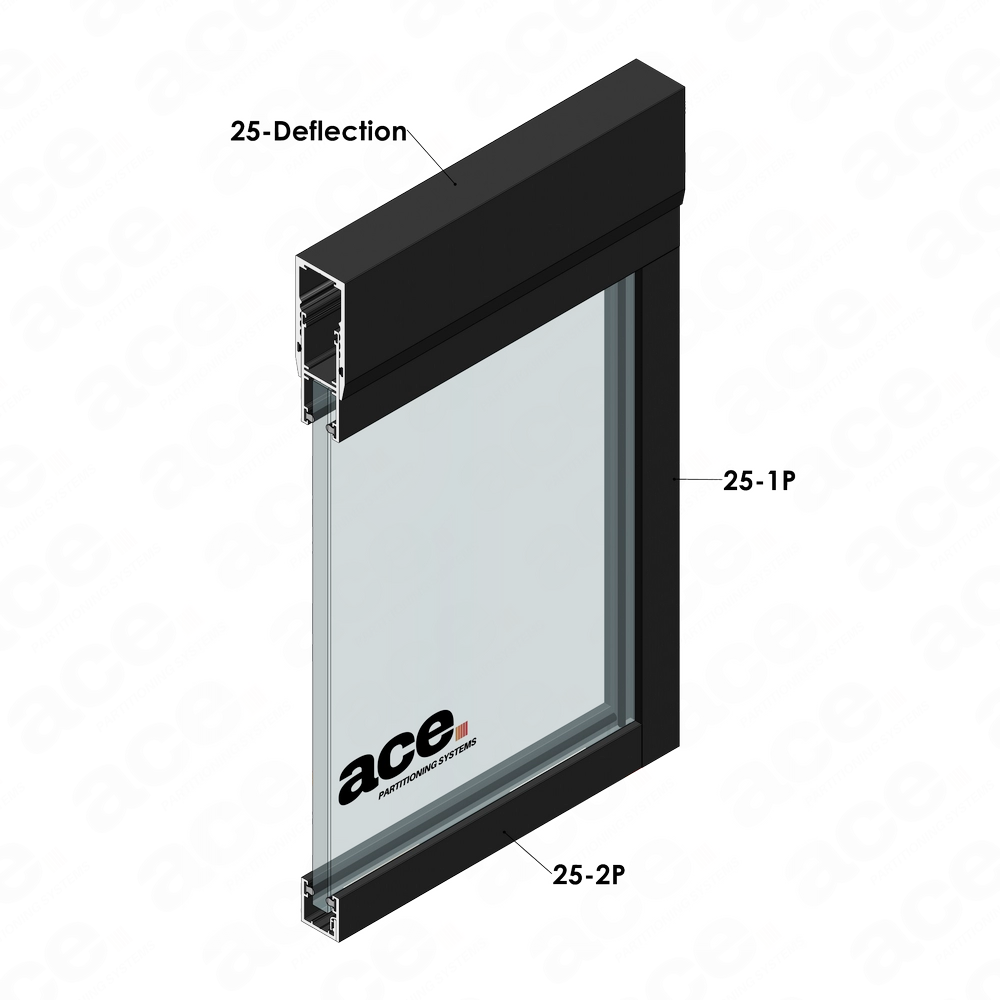 The 25mm aluminium U channel deflection set consists of male and female sections engineered to provide a deflection range of ±25mm, allowing accommodation of structural movement in glass partition installations. This two-part system ensures stability without compromising on flexibility, making it ideal for dynamic architectural environments.