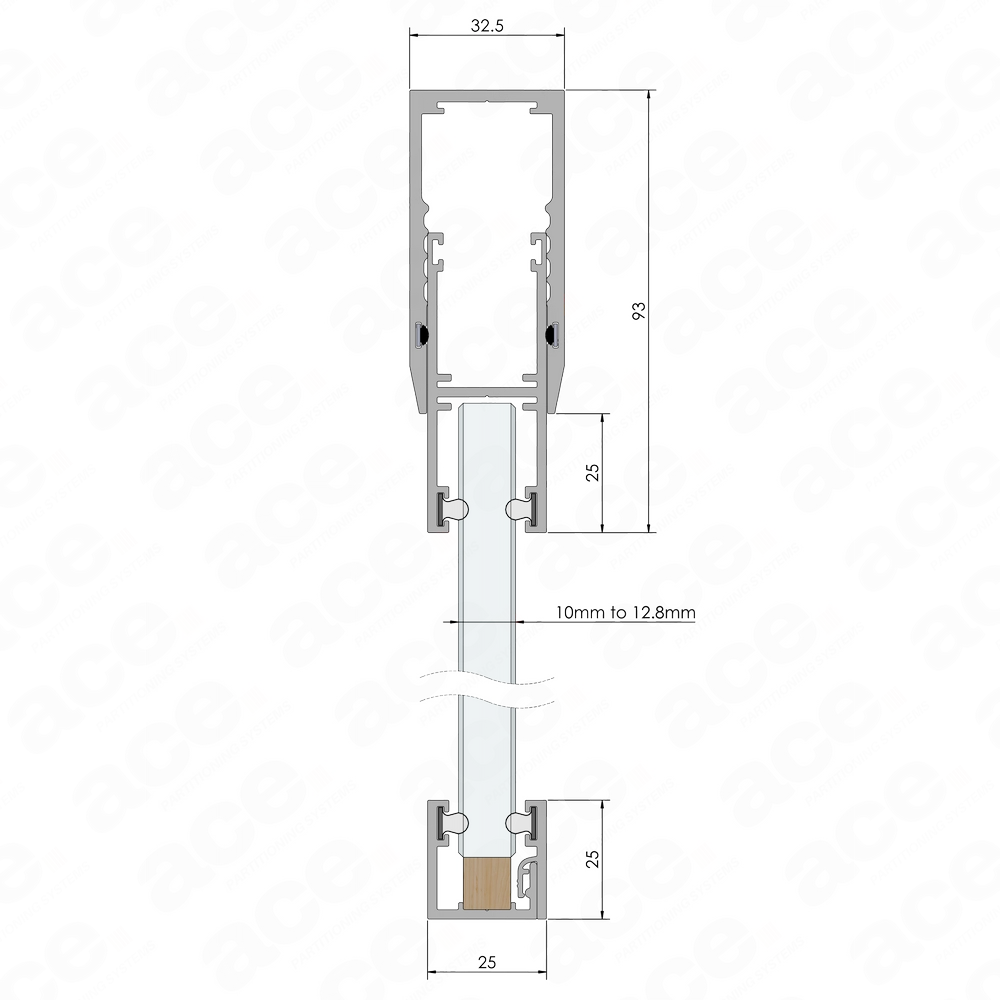 The female section measures 32.5mm in width by 68mm in height, while the male section is 25mm wide and 63mm high, combining to an overall height of 93mm. The male aluminium u channel includes a pre-inserted Q-Lon acoustic seal, supporting glass thicknesses of 10mm/10.8mm or 12mm/12.8mm for enhanced noise reduction. The female section features a pre-inserted brush seal that prevents scratching between components, extending the lifespan and maintaining the finish of your system.
